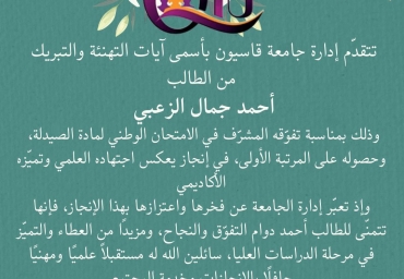 تتقدّم إدارة جامعة قاسيون بأسمى آيات التهنئة والتبريك من الطالب أحمد جمال الزعبي وذلك بمناسبة...