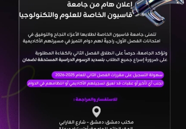 اقرأ المزيدإعلان هام... تُحيط إدارة جامعة قاسيون الخاصة للعلوم والتكنولوجيا علماً أبناءها الطلبة والخريجين...