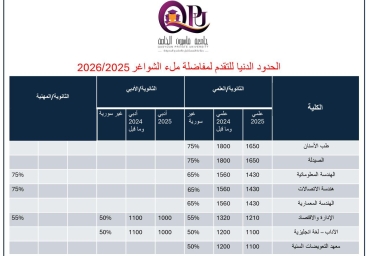 تعلن جامعة قاسيون الخاصة للعلوم والتكنولوجيا عن الحدود الدنيا للمعدلات المطلوبة لمفاضلة...