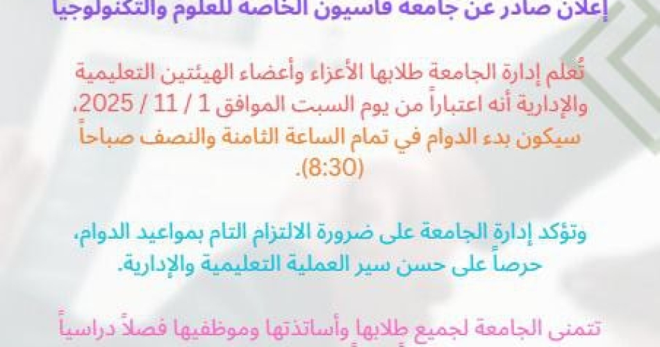 وتؤكد إدارة الجامعة على ضرورة الالتزام التام بمواعيد الدوام، حرصاً على حسن سير العملية التعليمية والإدارية.